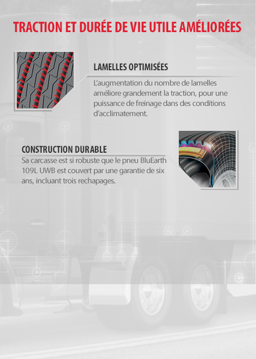 Dans le paysage ultra-concurrentiel d’aujourd’hui, seuls les pneus de remorque les plus économes en carburant vous permettront de garder une longueur d’avance sur la concurrence. C’est la raison pour laquelle nous avons conçu le BluEarth 109L UWB : un pneu de remorque tellement efficace qu’il est digne à la fois de la marque BluEarth et de la vérification SmartWay. Cela signifie qu’il est performant là où ça compte le plus : vos résultats nets.